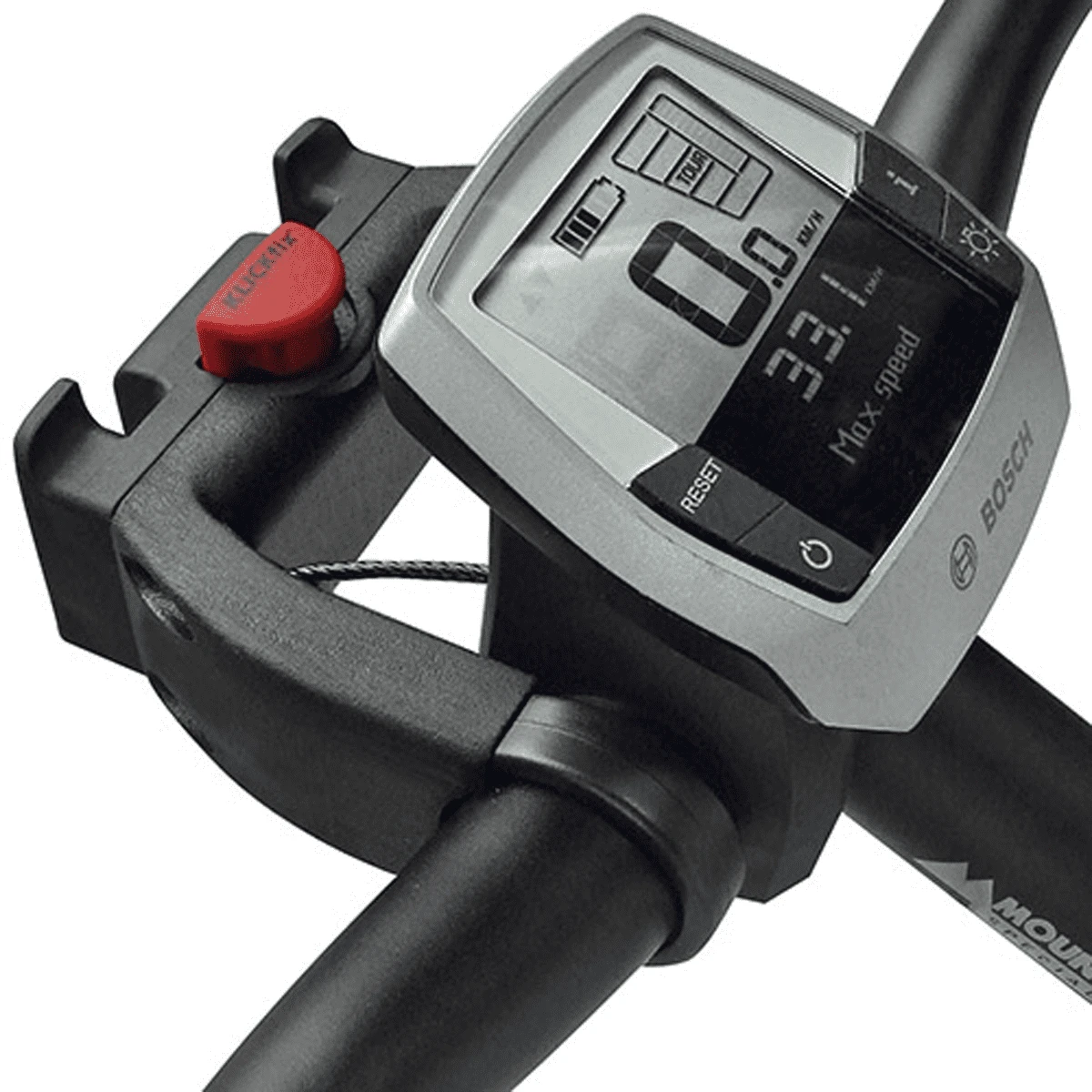Deze adapterversie kan naast een e-bike display worden gemonteerd. De extra brede montagebrug omsluit het scherm, zodat het niet opnieuw hoeft te worden gemonteerd. De adapter is aan de voorkant 22 mm langer dan de standaardversie.